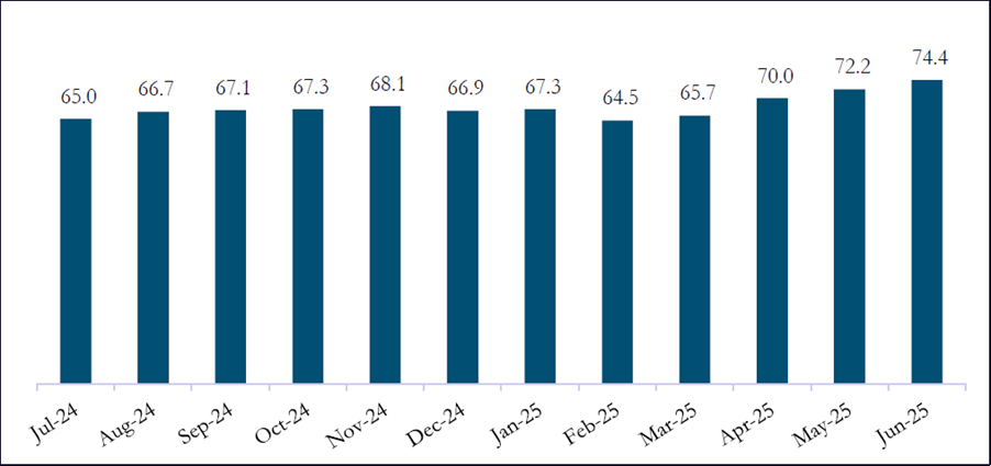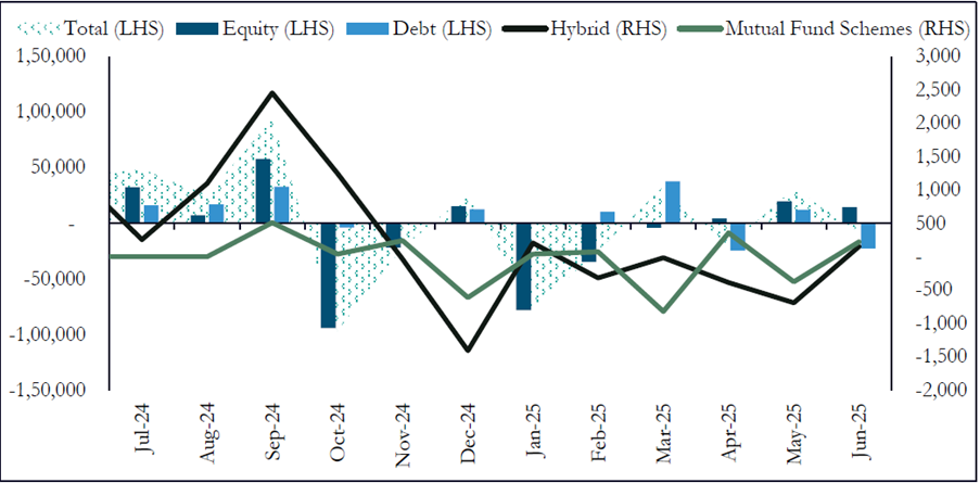 Investment trends of Foreign Portfolio Investors (FPIs) influence market sentiments and overall liquidity. FPIs tend to invest heavily in stable economies with growth potential and may pull out funds during the uncertain times. They move their funds between different markets based on their assessment of markets. While in June 2025, FPIs were net cash sellers of Indian securities with net inflows of ₹14,590 crore in the equity segment. In spite of this June movement, the trend is muted as FPIs have generally refrained from equity markets.